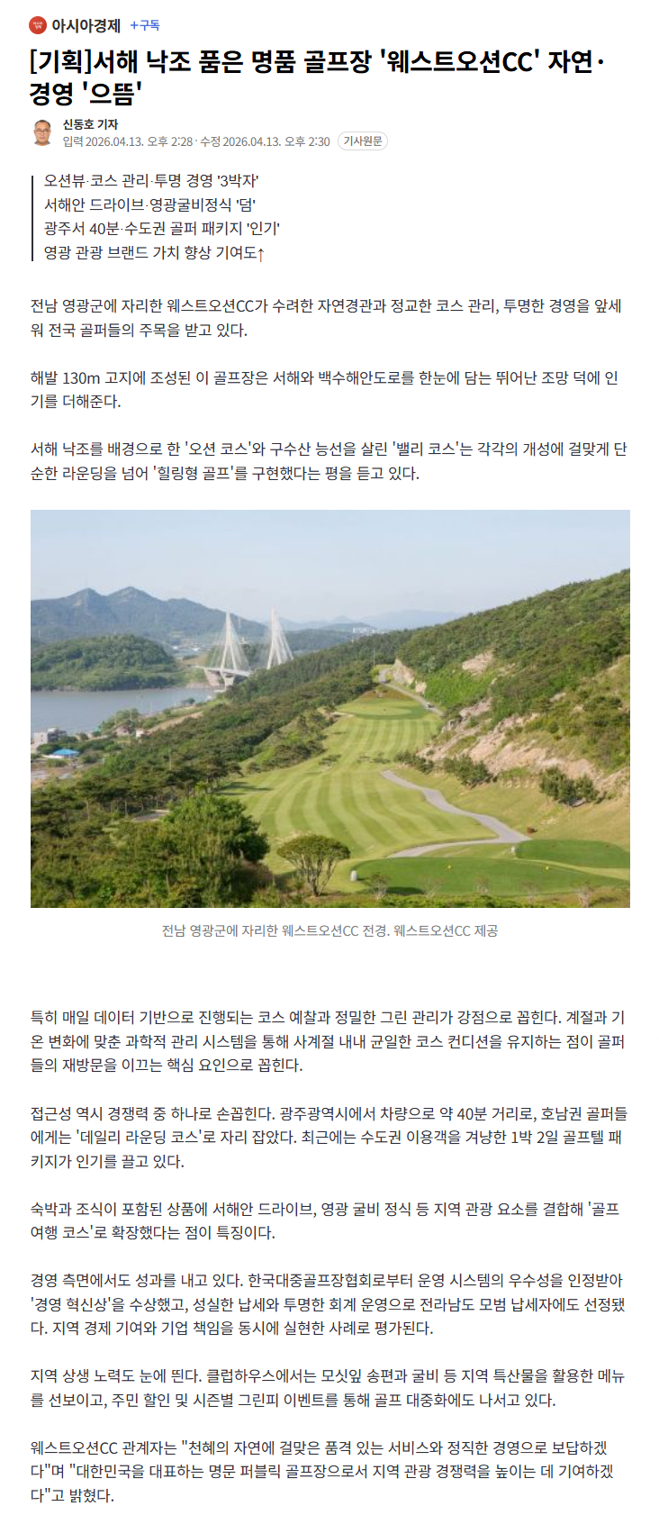 서해 낙조 품은 명품 골프장. 아시아경제신문